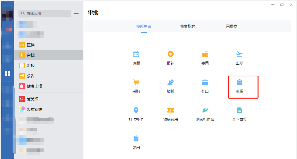 进入审批窗口,点击【发起申请】,找到【离职】选项,