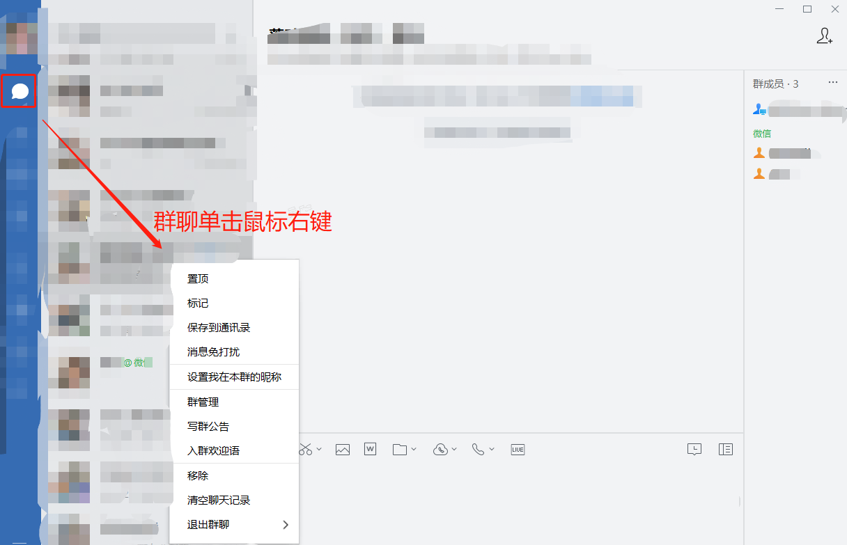 在左侧菜单栏点击群聊选项,单击鼠标右键,选择【写群公告】,