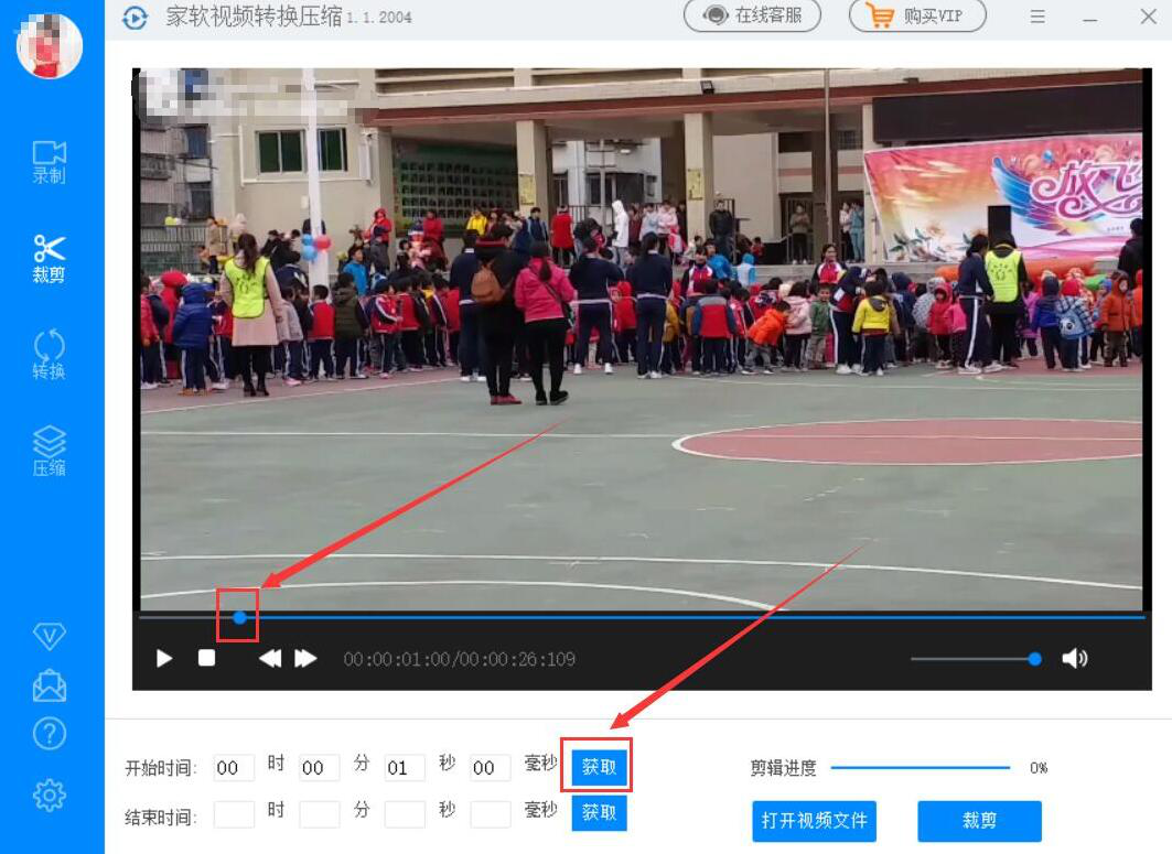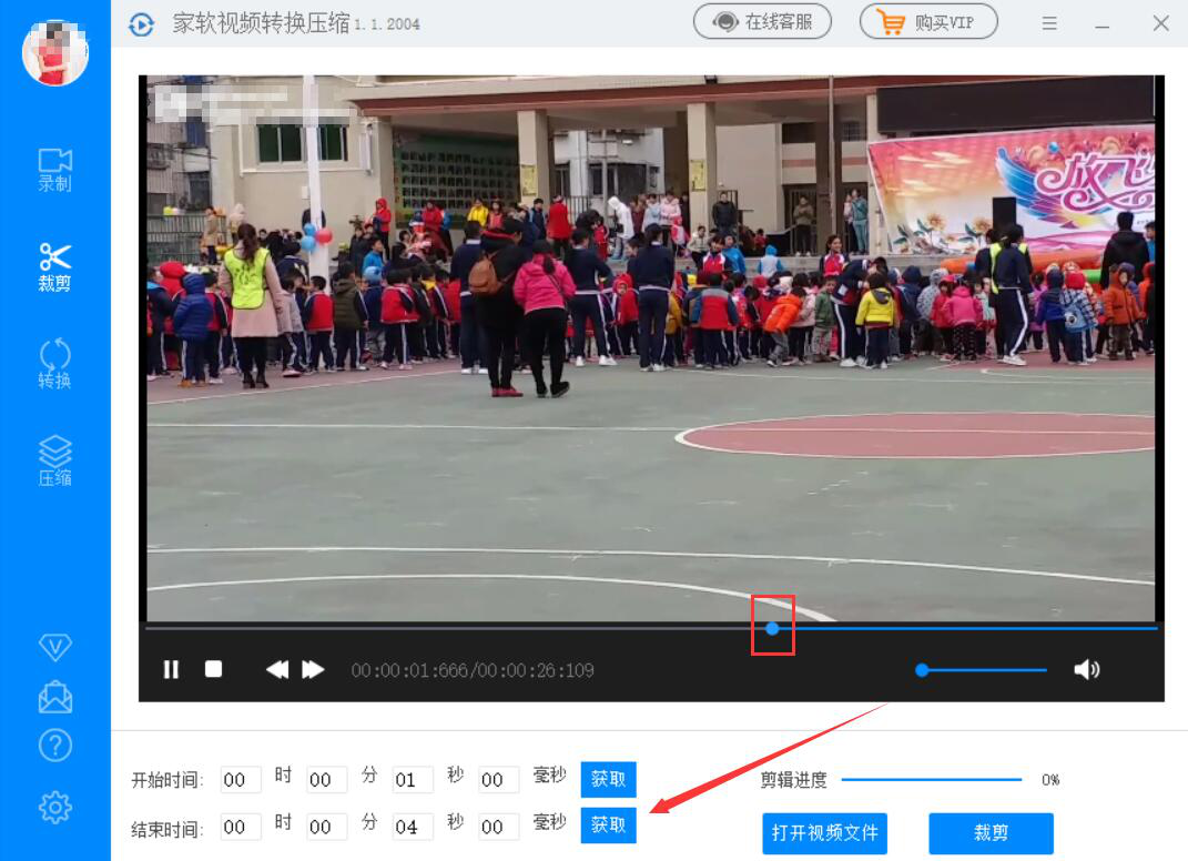 3、然后,我们回到家软视频转换压缩软件的裁剪操作界面,在时间轴上,用鼠标单击视频裁剪的开始位置,再点击开始时间中的“获取”按钮。