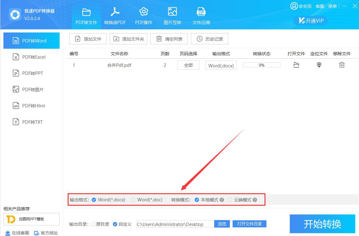 3、然后,我们回到我速PDF转换器操作界面,选择PDF转Word时的输出格式和转换模式。