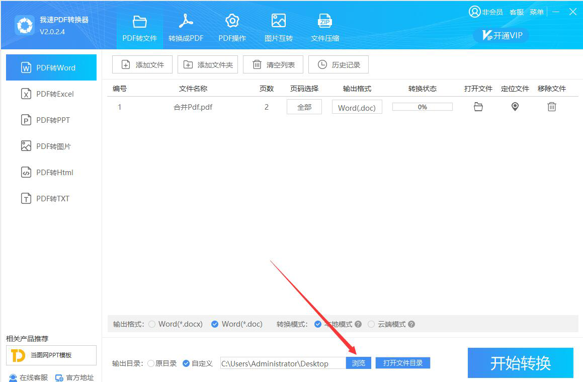 4、如果PDF转Word后的文件输出目录需要更改,就点击我速PDF转换器界面中的“浏览”按钮。