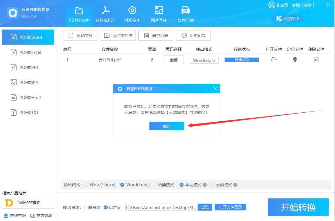 6、PDF转word的输出格式、转换模式、输出目录都设置好了后,我们点击界面右下方的“开始转换”按钮,我速PDF转换器便开始将PDF转word。
