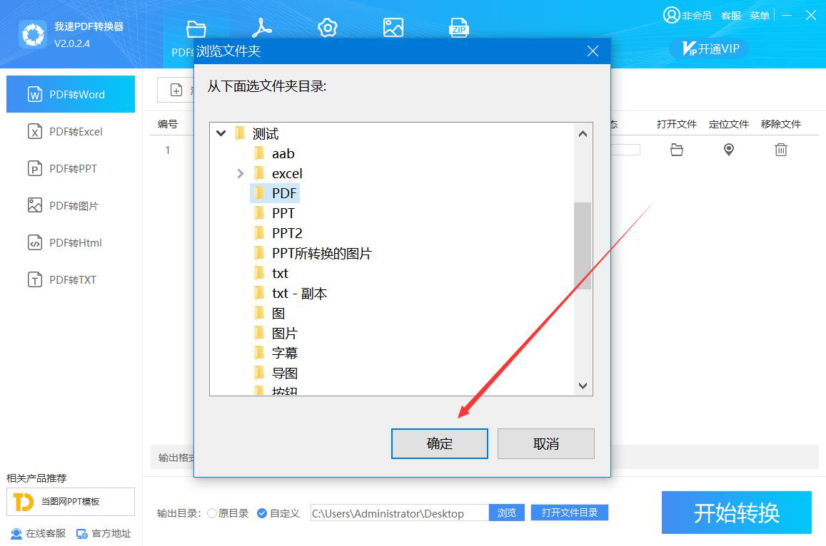 5、接下来,我们在我速PDF转换器弹出的浏览文件夹窗口中,选择PDF转word后的文件保存路径,再点击“确定”按钮。