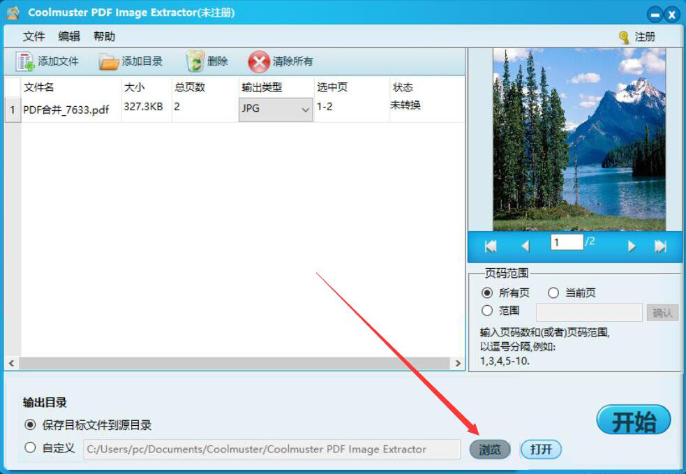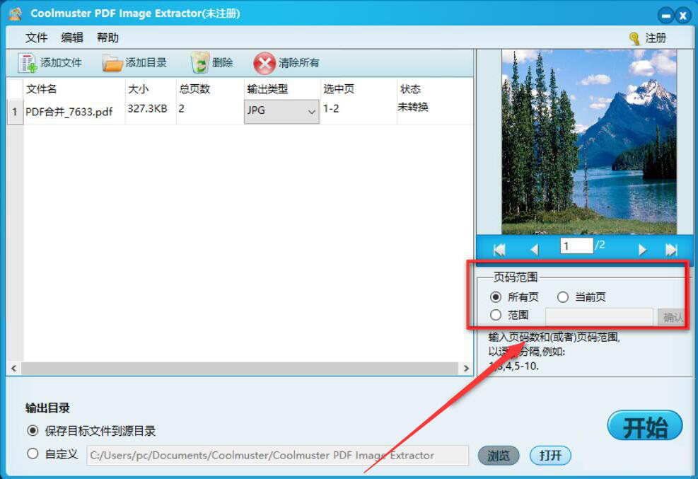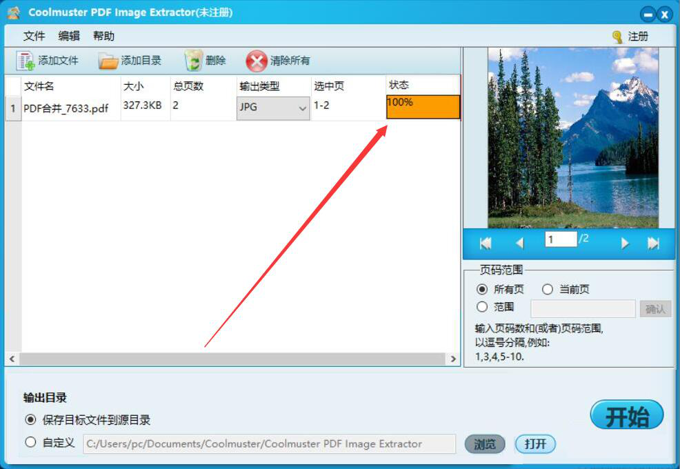 5、页码范围和输出目录都设置好了后,我们点击界面右下方的“开始”按钮,Coolmuster PDF Image Extractor便开始提取PDF文件的图片。