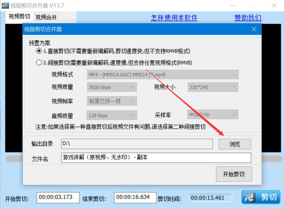 7、此时,音视频剪辑大师便会弹出视频剪切合并器窗口,我们根据自己的需要选择剪切的方案。如果视频剪切后的输出目录需要更改,就点击如下图的“浏览”按钮。