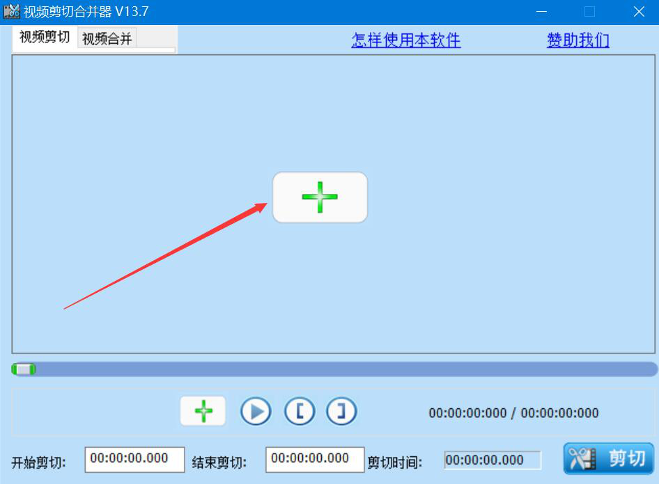 2、进入音视频剪辑大师的视频剪切界面后,点击如下图的“+”按钮,准备添加文件。