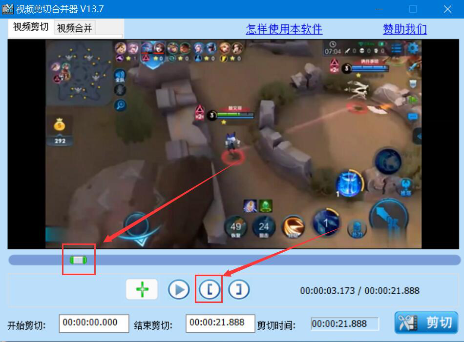 5、同样的方法,鼠标左键移动滑块快速定位至视频剪切的结束位置,并点击时间轴下方的“]”按钮,确定视频剪切片段的结束时间点,如下图所示。