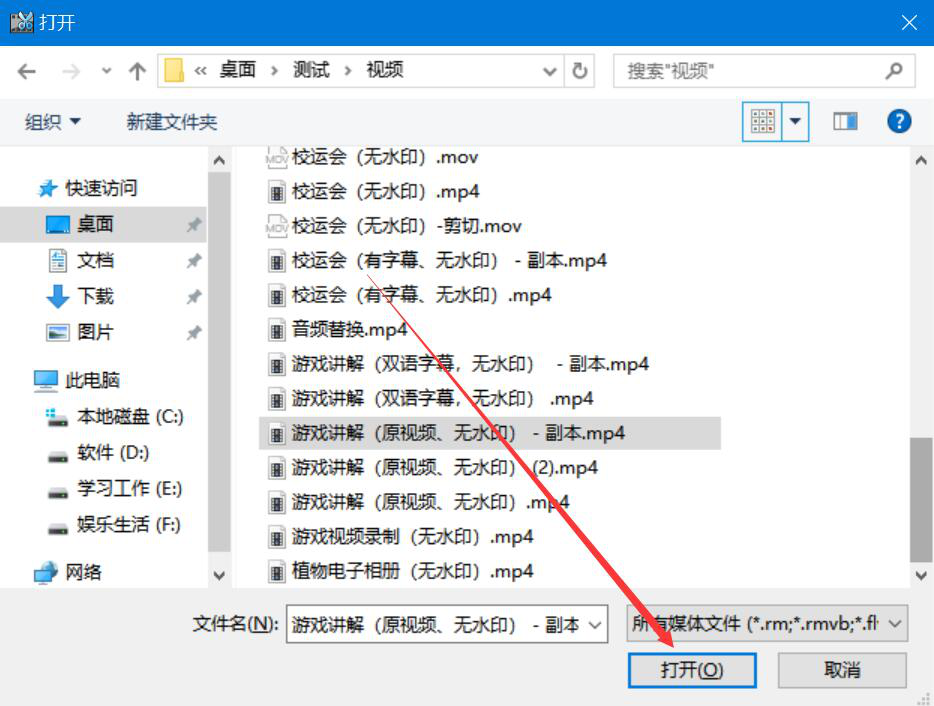 3、然后,我们在弹出的窗口中,选择需要剪切的视频文件,并点击“打开”按钮,将其导入音视频剪辑大师。