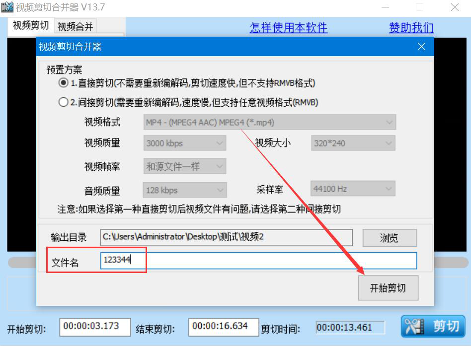 9、最后,我们命名视频剪切后的文件,再点击“开始剪切”按钮,音视频剪辑大师便会剪切并保存视频片段。