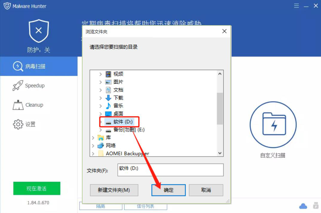 2、然后,在弹出的浏览文件夹窗口中,我们选择需要Glarysoft Malware Hunter Pro扫描并查杀病毒的某个磁盘或者文件,例如这里扫描的是D盘,点击“确定”按钮。