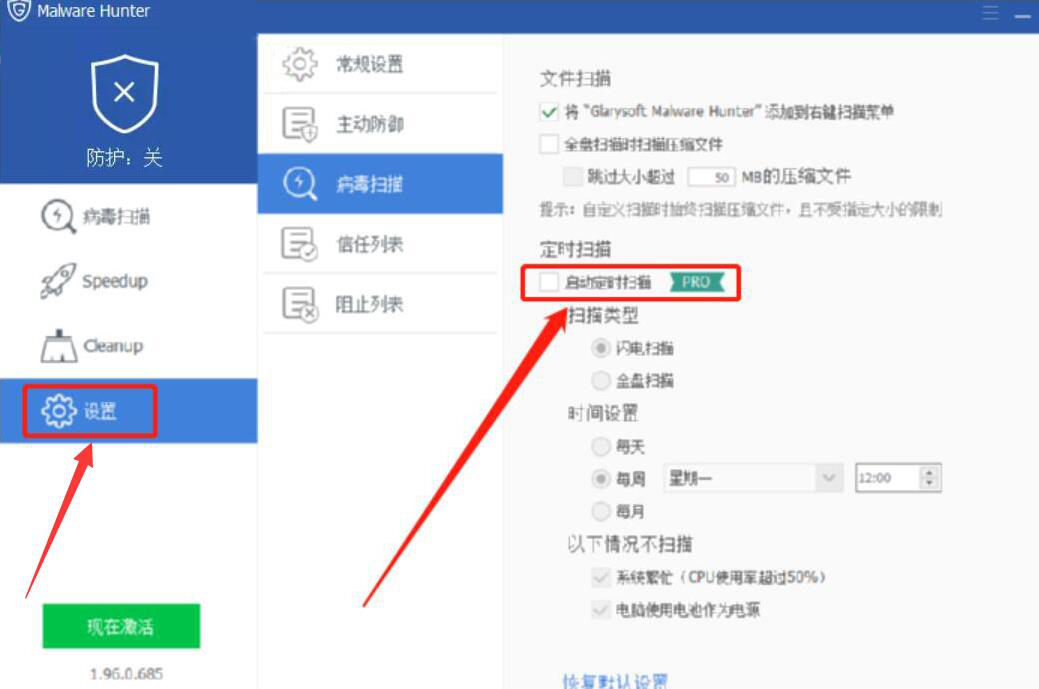 5、最后,为了保护电脑的系统安全,我们还可以切换至Glarysoft Malware Hunter Pro的设置界面,点击进入“病毒扫描”选项卡,勾选“启动定时扫描”选项。这样做可以让Glarysoft Malware Hunter Pro及时帮助我们查杀电脑病毒。