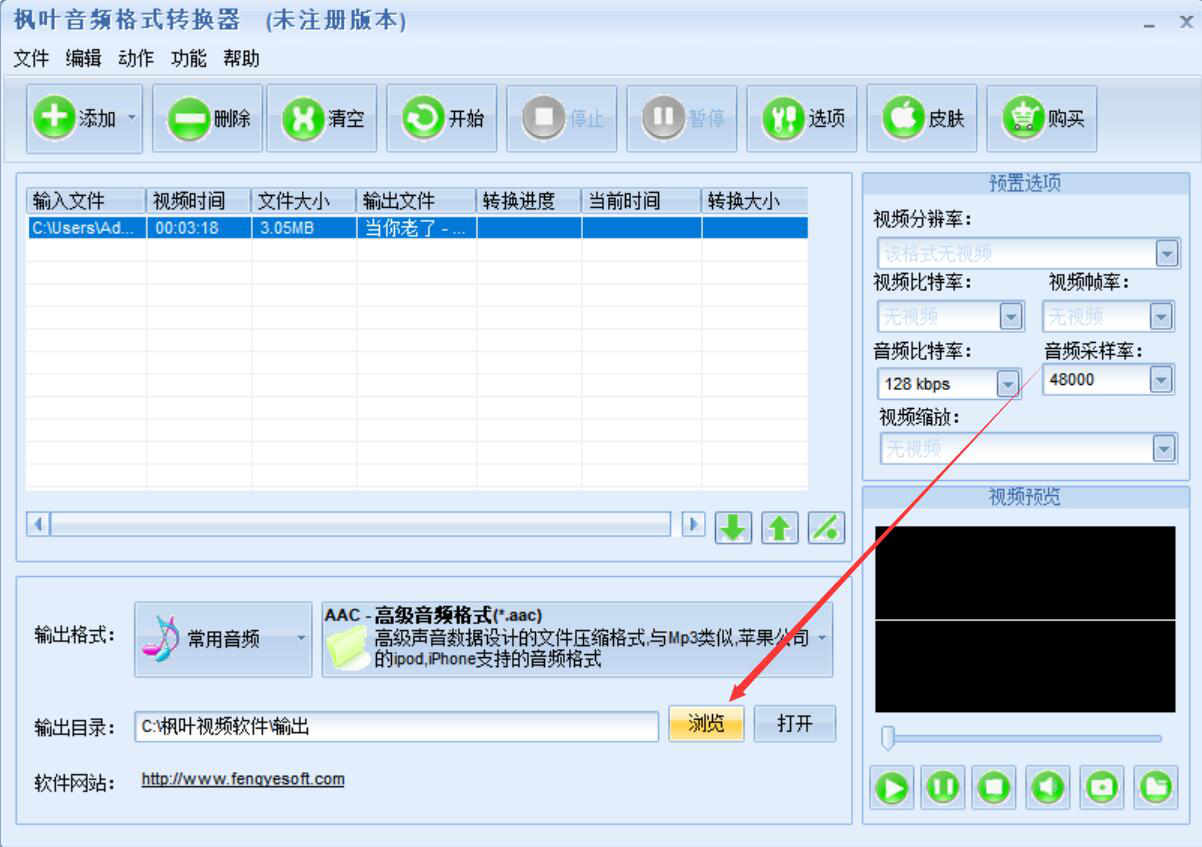 4、如果MP3转换为AAC的音频的输出目录需要更改,就点击枫叶音频格式转换器界面中的“浏览”按钮。