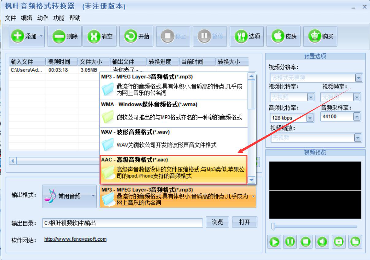 3、接下来,我们在枫叶音频格式转换器的输出格式中,将原来的MP3格式更改为“AAC-高级音频格式”。