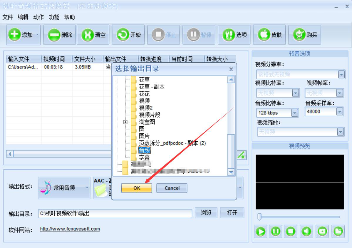 5、此时,枫叶音频格式转换器便会弹出输出目录窗口,我们选择MP3转换成AAC后的音频保存路径,再点击“OK”按钮。
