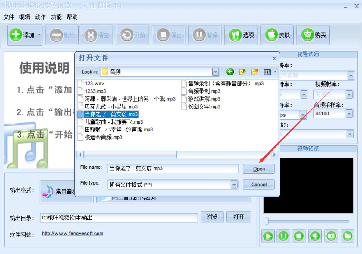 2、然后,在弹出的窗口中,我们选择需要转换成AAC格式的MP3音频选中,并点击“Open”按钮,将其导入枫叶音频格式转换器。