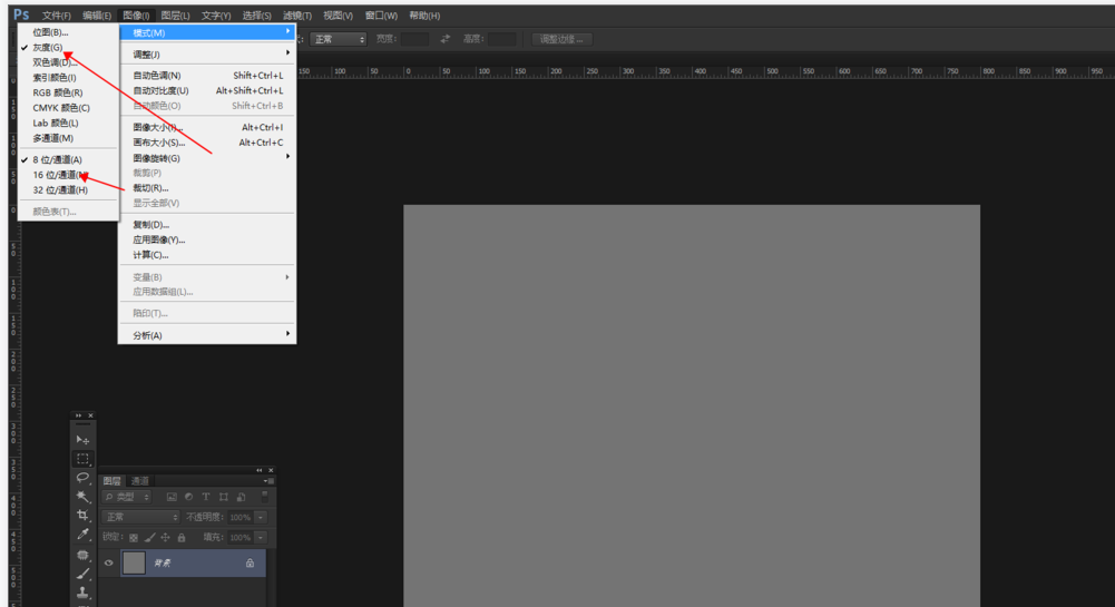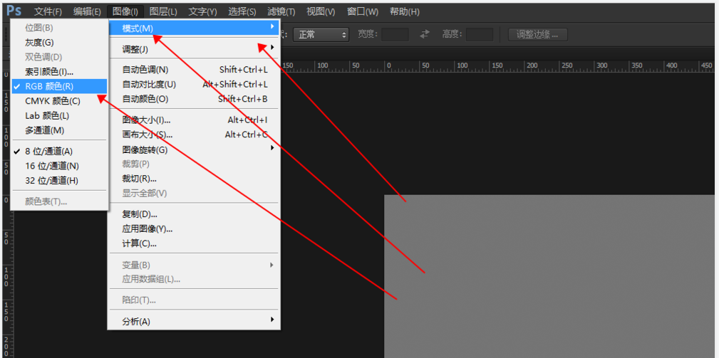 想要解决这个灰色问题其实很简单,只需修改模式,在PS菜单栏点击【图像】——【模式】,看看模式是否灰色,