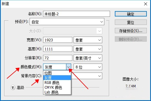 如果是灰色模式,就修改成RGB模式,如图所示,