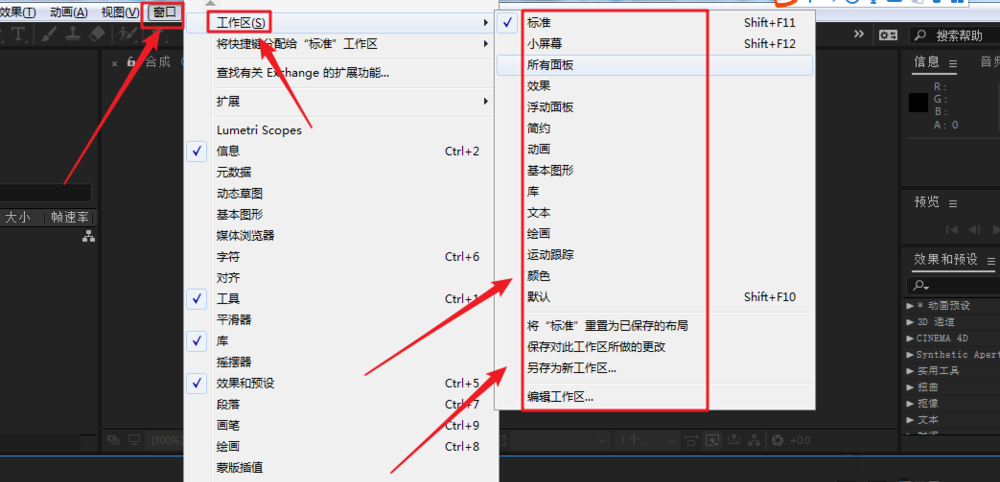 在上方菜单栏点击【窗口】——【工作区】选项,找到自己想要设置的面板工作区,进行勾选,这样可以节省自己设置排布的时间,当然了,你也可以省略这一步,
