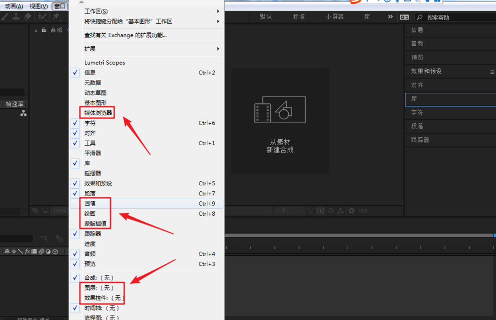 有些常用的工具并没有在面板中展示,那么大家可以自行添加,在菜单栏点击【窗口】,找到需要添加的选项进行勾选,