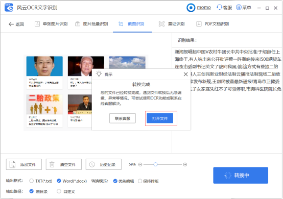 截图识别文字完成,会弹出一个提示框,点击中间的【打开文件】,即可查看识别出来的文字内容。