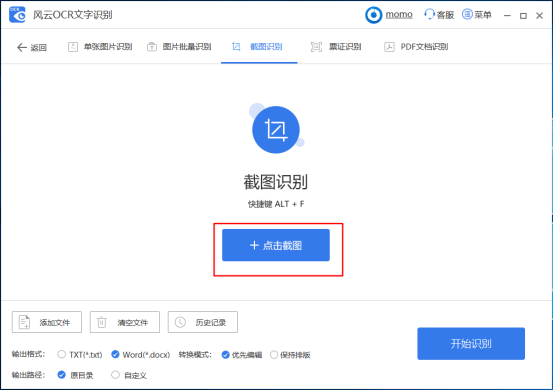 首先下载安装风云OCR文字识别软件,打开软件,进入界面,这里提供了多种模式,本文介绍的是识别截图图片内容,所以选择【截图识别】功能,