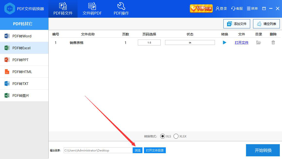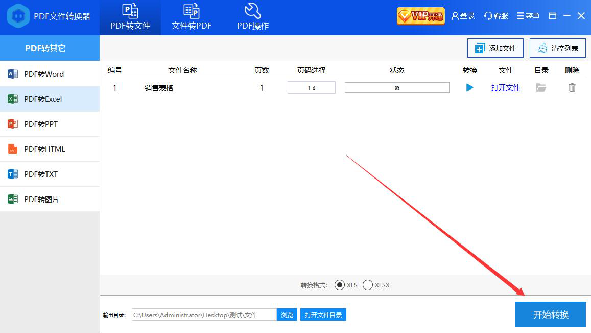 6、转换格式和输出目录都设置好了后,我们点击界面右下方的“开始转换”按钮,彩虹猪PDF转换器便开始将PDF文件转Excel。