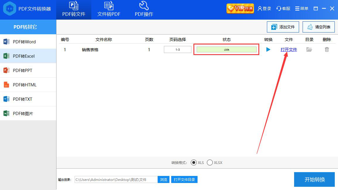 7、最后,我们在界面中看到状态显示100%,说明彩虹猪PDF转换器已经将PDF文件转Excel了。我们点击“打开文件”便可以打开保存好的Excel文件了。
