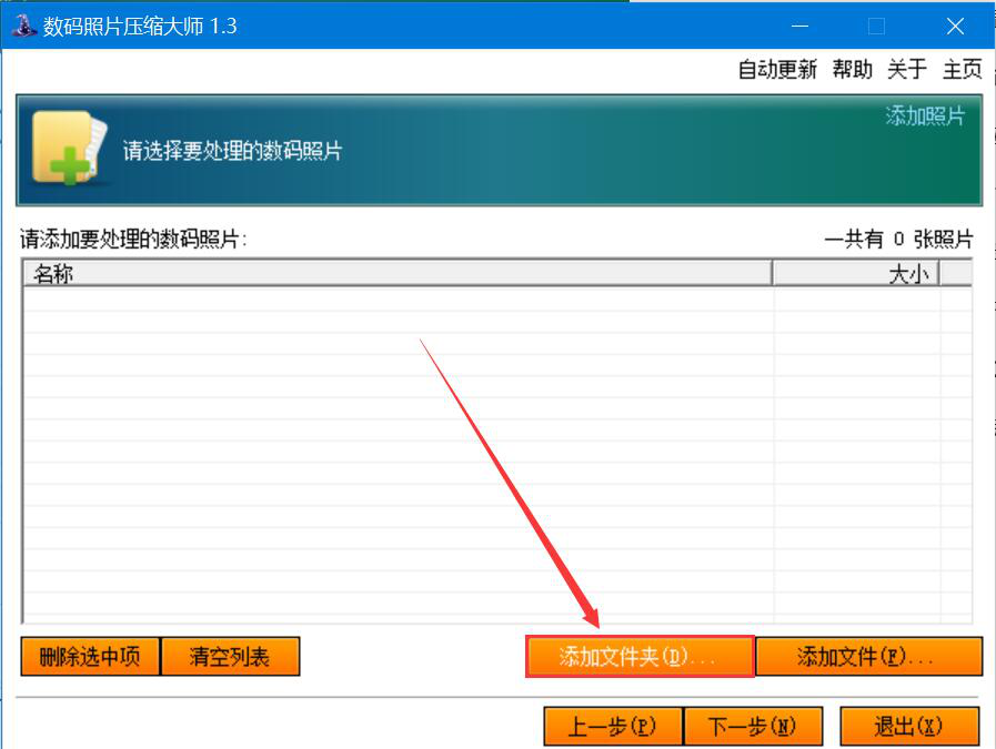 1、首先,我们打开数码照片压缩大师,点击界面右下方的“添加文件夹”按钮。