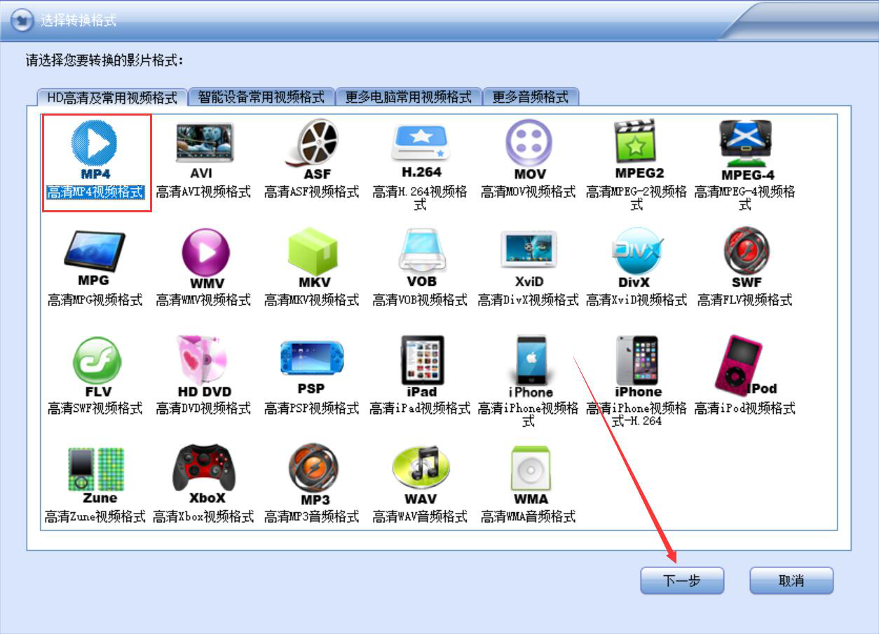 3、然后,我们切换至“HD高清及常用视频格式”选项卡,并根据自己的需要选择高清的视频格式,再点击界面右下方的“下一步”按钮。