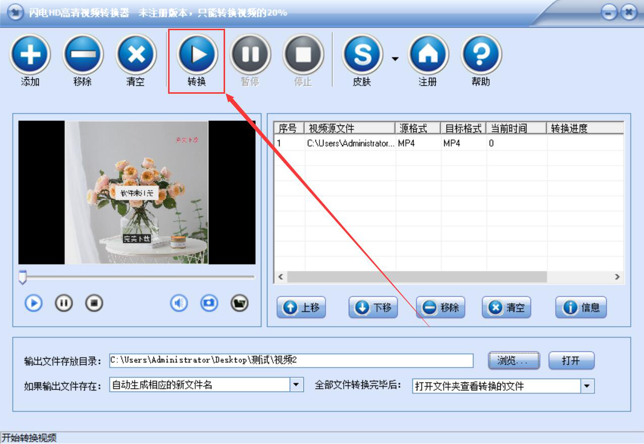 7、接着,我们点击界面上方的“转换”按钮,闪电HD高清视频转换器便开始将视频转换成高清格式。