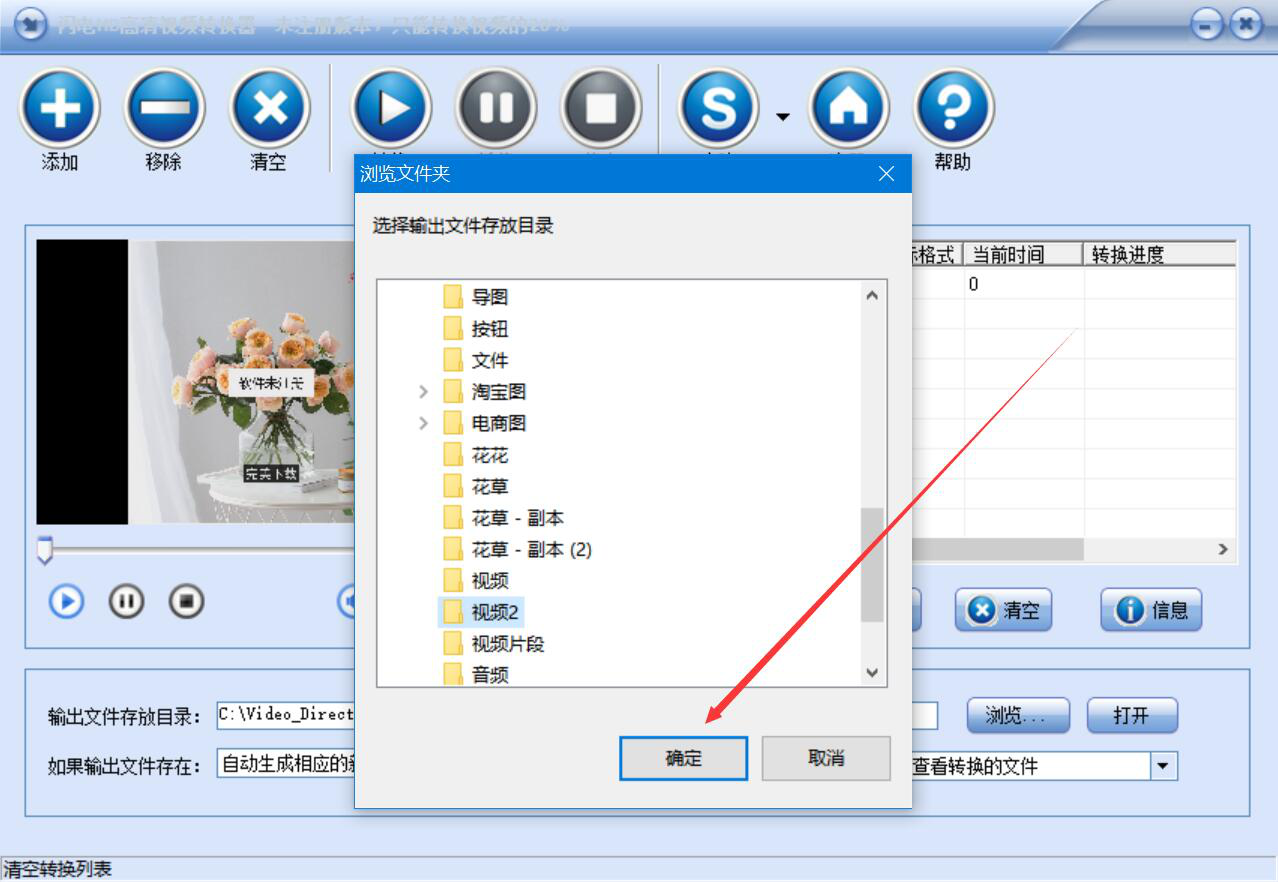 6、此时,闪电HD高清视频转换器便会弹出浏览文件夹窗口,我们选择视频转换成高清格式后的存放路径,再点击“确定”按钮。
