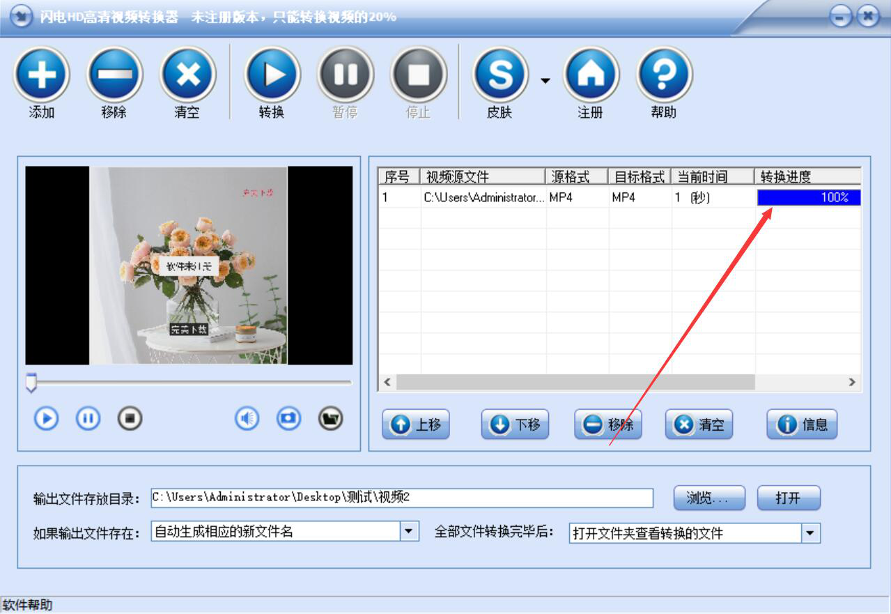 8、最后,当转换进度显示100%时,则说明闪电HD高清视频转换器成功地将视频转换成高清格式了。
