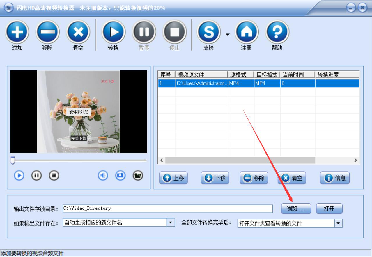 5、回到闪电HD高清视频转换器操作主界面,如果视频转换成高清格式后的文件存放目录需要更改,就点击“浏览”按钮。