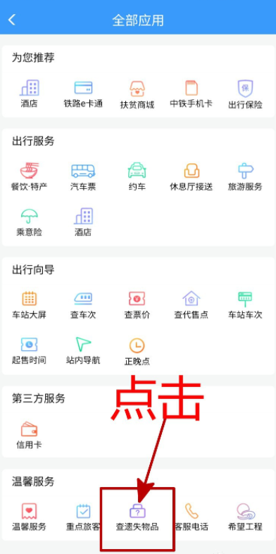 展开全部应用,下滑页面,点击【温馨服务】——【查遗失物品】,
