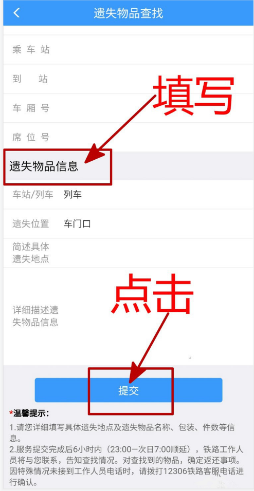 然后填写遗失物品信息,点击提交,等待处理。