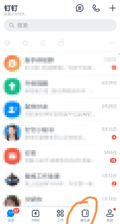 打开手机钉钉APP,进入消息界面,在底部点击切换【通讯录】,
