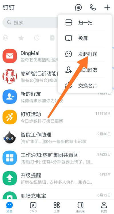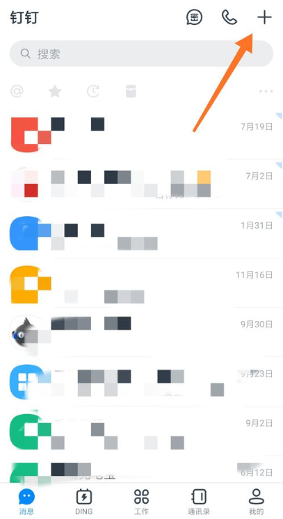 在手机中打开钉钉APP,登录账号,进入消息界面,点击右上角【+】,