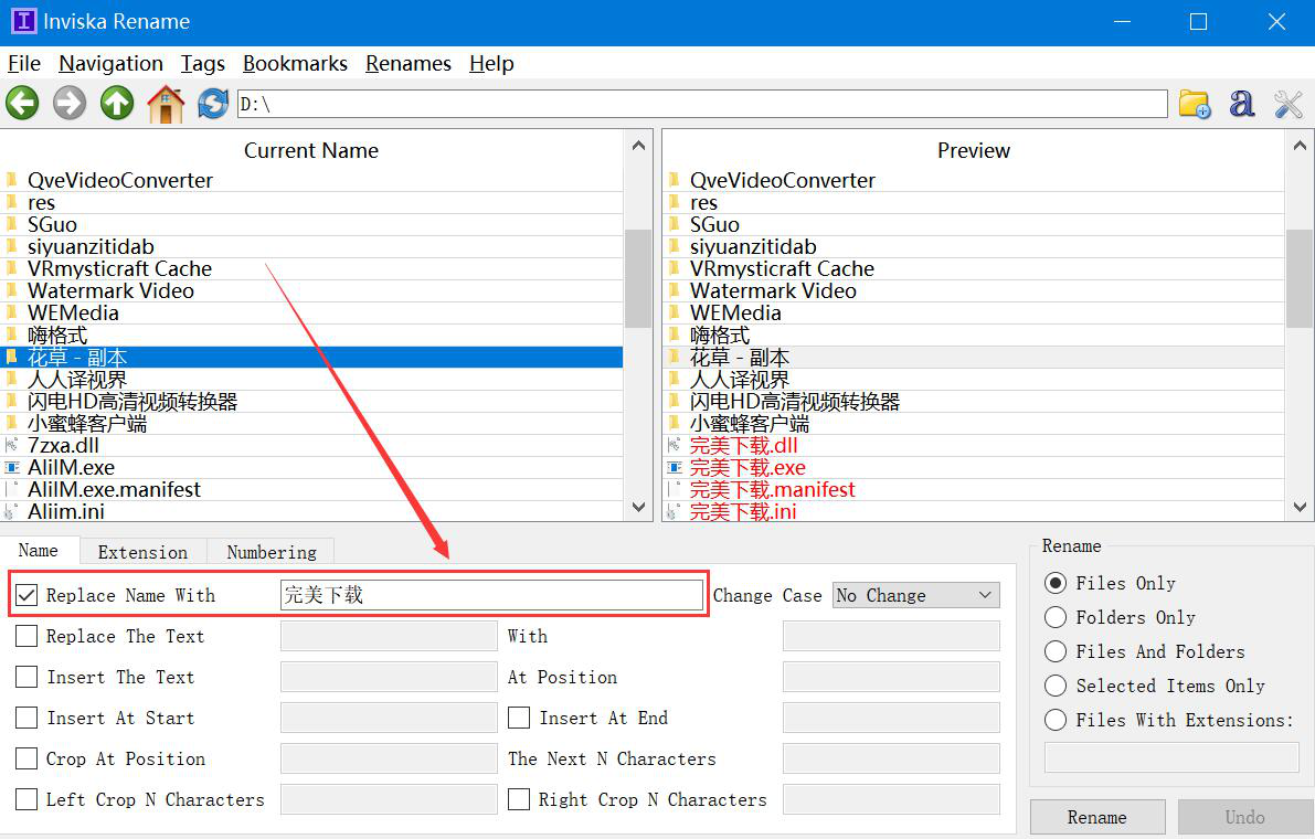 2、然后,在该磁盘展开的文件列表中,我们点击自己想要批量重命名的文件夹,再切换至Inviska Rename的“Name”选项卡,并勾选“Replace Name With”选项,输入自己想要重命名文件的名称。