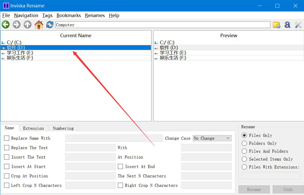 1、首先,我们打开Inviska Rename软件,点击自己想要批量重命名文件所在的磁盘。