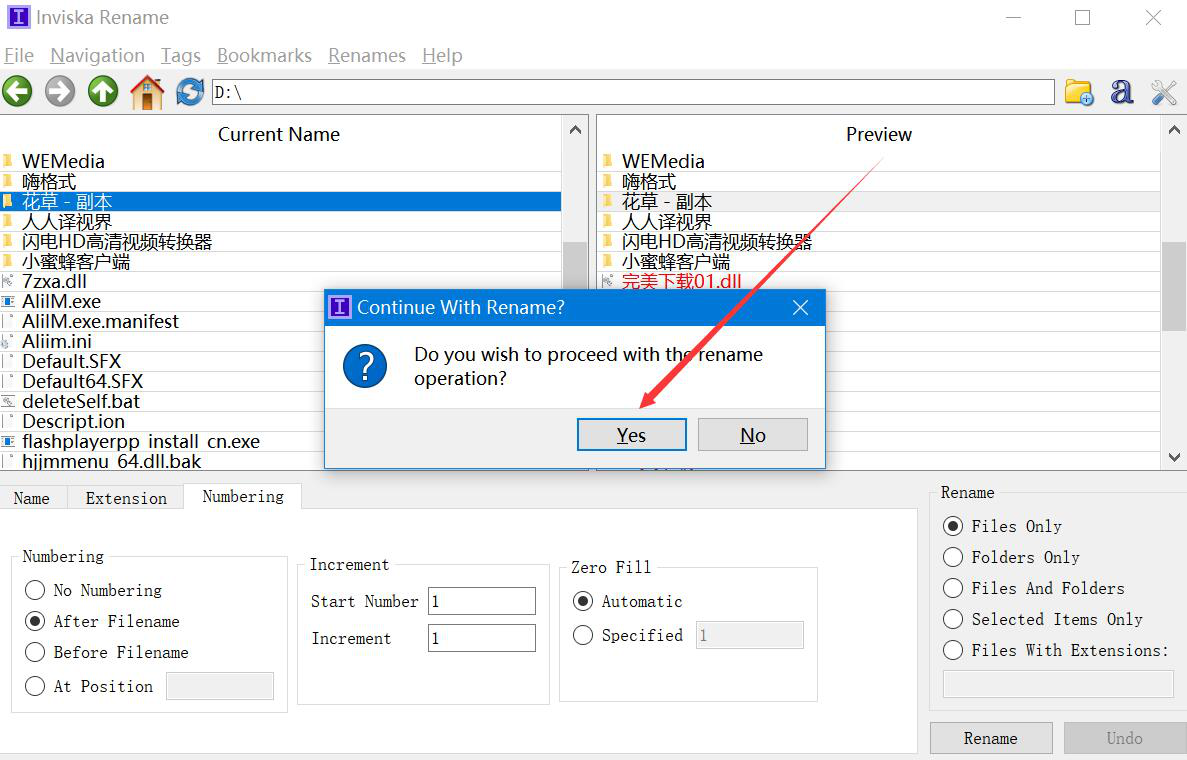 6、最后,弹出如下图窗口提示,我们直接点击“Yes”按钮,让Inviska Rename继续完成批量重命名文件的命令。