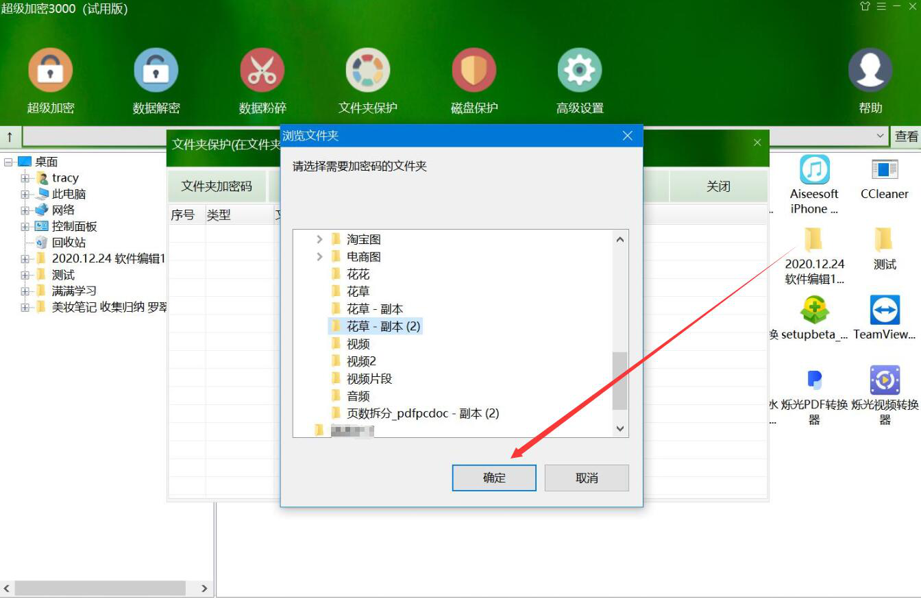 3、我们继续在超级加密3000弹出的浏览文件夹窗口中,选择需要加密的文件夹,并点击“确定”按钮。