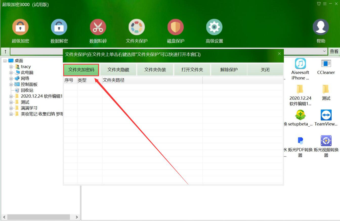 2.然后,在超级加密3000弹出的文件夹保护窗口中,我们点击“文件夹加密码”按钮。