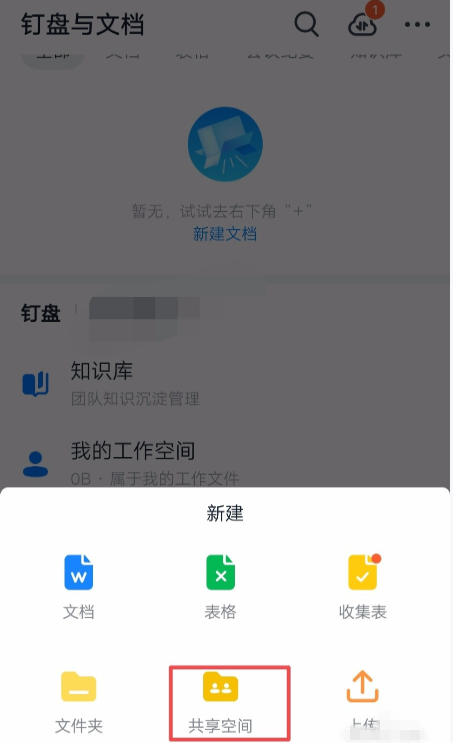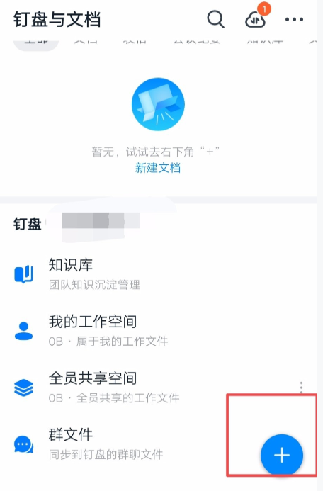 在手机中打开钉钉APP,登录账号,进入界面,点击切换至【文档】窗口,如图,点击【+】,
