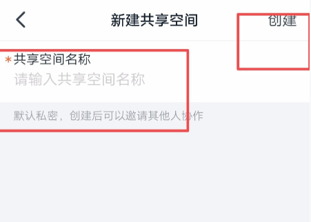 进入新建共享空间窗口,设置名称,点击【创建】,共享空间默认私密,创建之后可以邀请其他人协作,