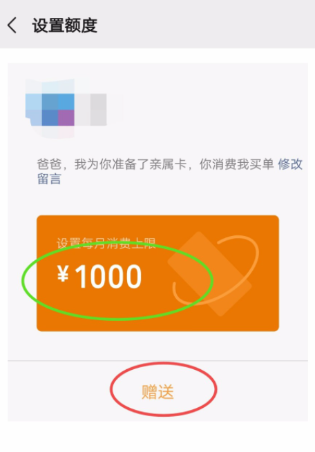 设置每月消费上限,最高可设置3000元/月,点击【赠送】,输入微信支付密码(可选择扣款方式),即可成功赠送亲属卡。