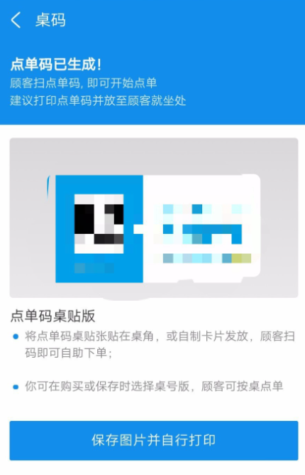 添加之后点击确定,打印出二维码图片贴在餐桌上,顾客扫描二维码就可以自助点单了。