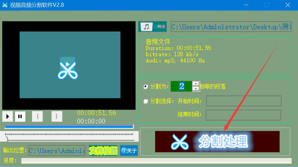 6、文件位置设置好了,我们就点击界面右下方的“分割处理”按钮,视频音频分割软件便开始分割音频。