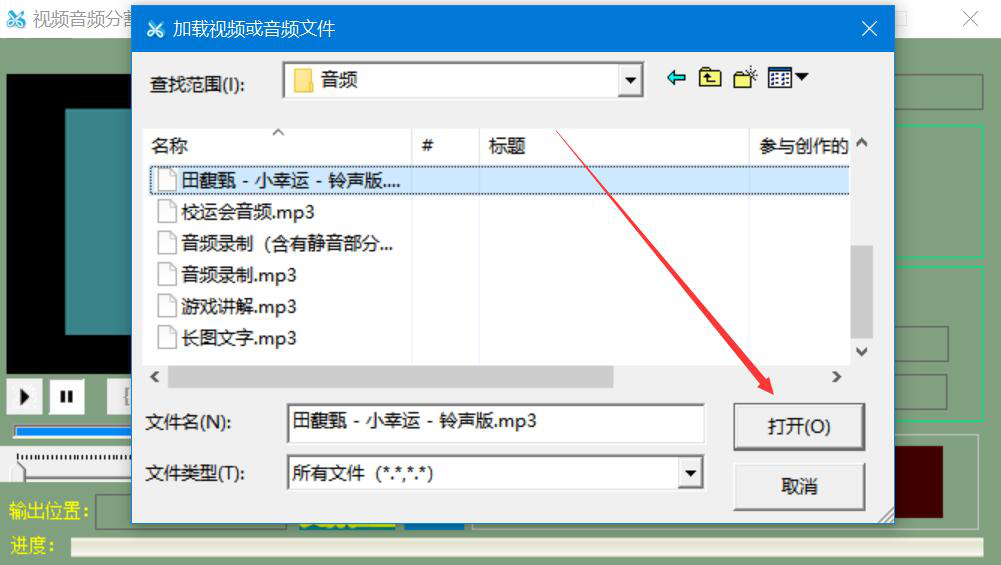 2、在弹出的窗口中,我们选择需要分割的音频,并点击“打开”按钮,将其导入视频音频分割软件。