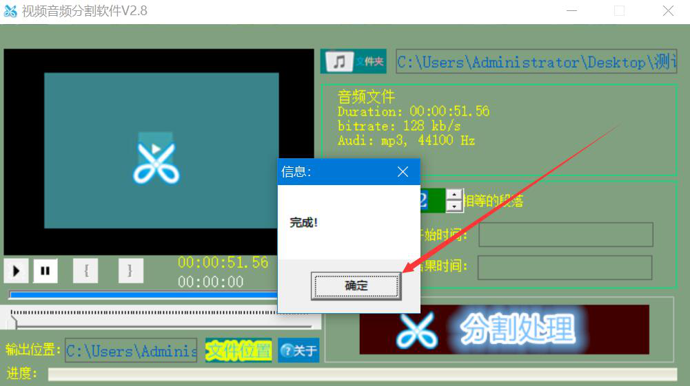 7、最后,弹出如下图的信息窗口,说明视频音频分割软件成功分割了音频,我们直接点击“确定”按钮即可。