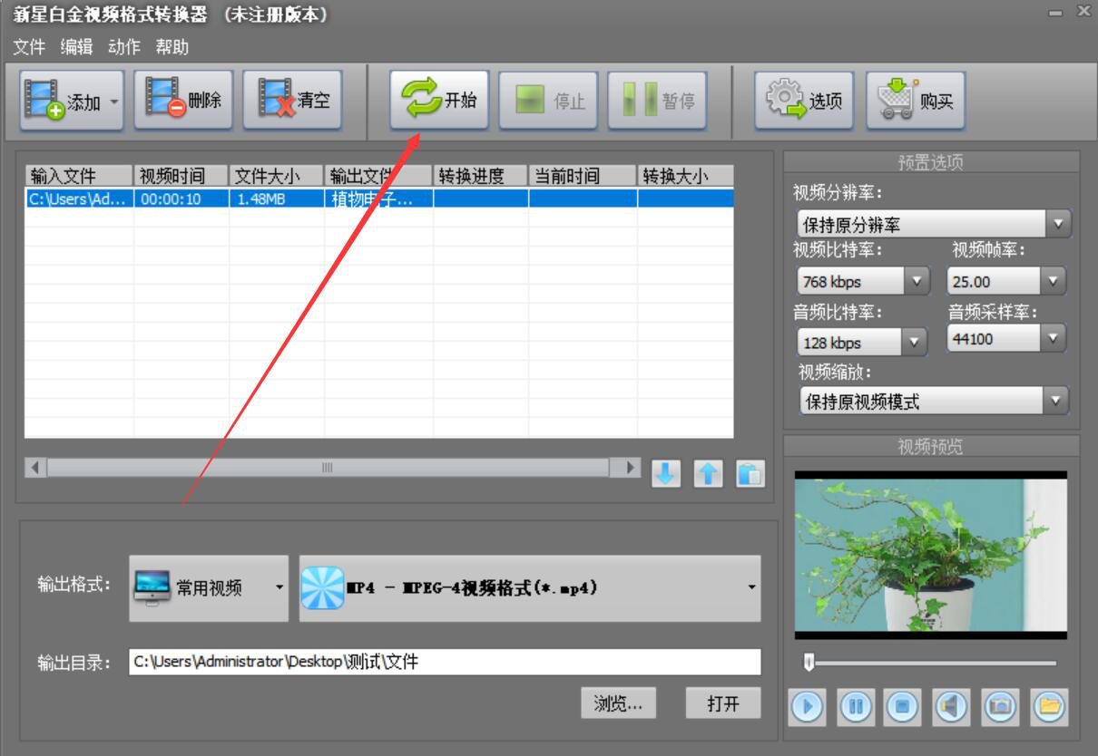 6、输出格式和输出目录都设置好了后,我们点击界面功能栏中的“开始”按钮,新星白金视频格式转换器便开始将AVI转换成MP4。